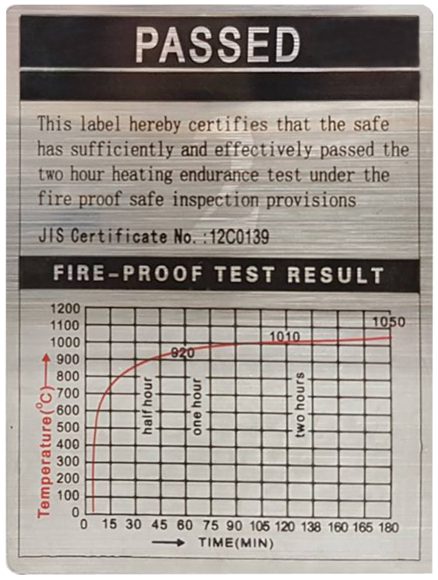 櫃體為防火材質100%二氧化矽,『經國際公認之日本JIS檢驗合格』防火溫度達到連續攝氐1010度兩小時的認證,日本JIS防火兩小時標籤編號為:CS-1008。